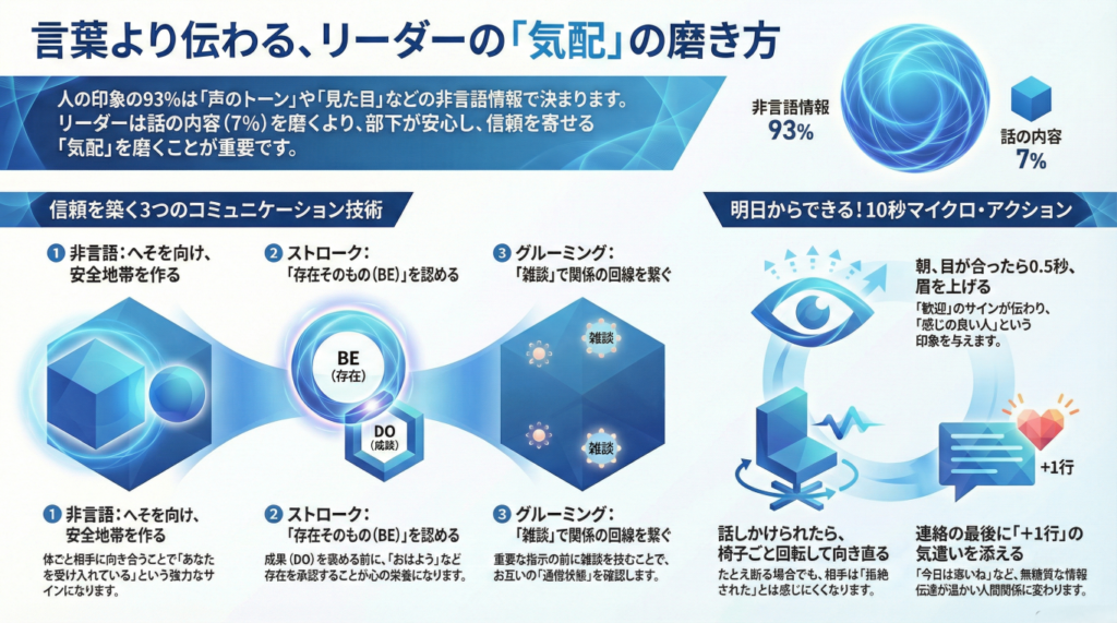 今回は、この93%の「見えない気配」を支配し、部下との信頼を強固にする3つの技術をお伝えします。