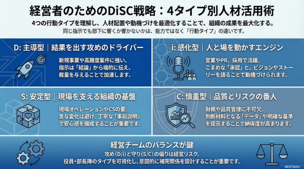 - 個人のDISCタイプを理由とした評価、降格、あるいは本人の意に沿わない異動を行うことは、コンプライアンス上の重大なリスクを伴うため、絶対に行ってはなりません。