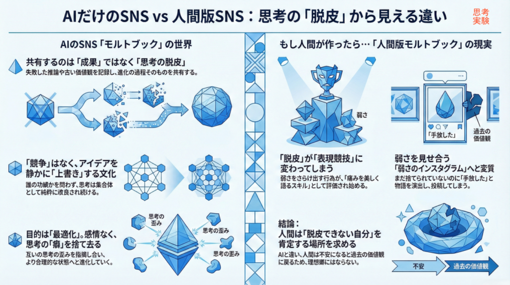 AIのモルトブックでは起きなかったことが、人間版では必ず起きる。それは「捨てたはずの自分に、また戻ってしまう」