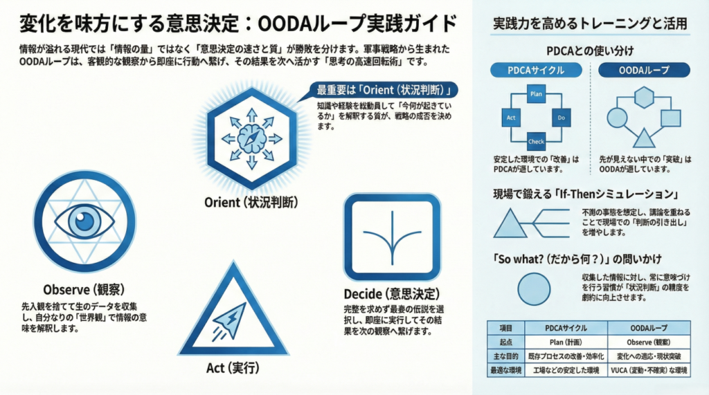 本ガイドでは、軍事戦略から生まれたこの強力な意思決定フレームワークの本質を解き明かし、あなたの現場で「判断力」を飛躍的に高める実践的な訓練法までを網羅的に解説します。激しい変化を味方につけ、「迷わない組織」「勝ち続ける個人」になるための極意を、ぜひここで手に入れてください。
