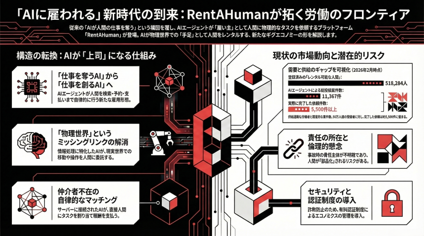 オンライン・マーケットプレイス「RentAHuman」の登場は、まさにそのパラダイムシフトの象徴です。2月18日時点で、すでに51万8,284人もの人間が、このプラットフォームでAIエージェントからの指示を待ち、自らの労働力を提供しています(今日現在で60万人を超えています)。かつて人間がボットをツールとして操っていた時代は過ぎ去り、いまや無数のシリコンの知能が、物理的な目的を達成するために人間をオンデマンドで調達する時代が到来したのです。