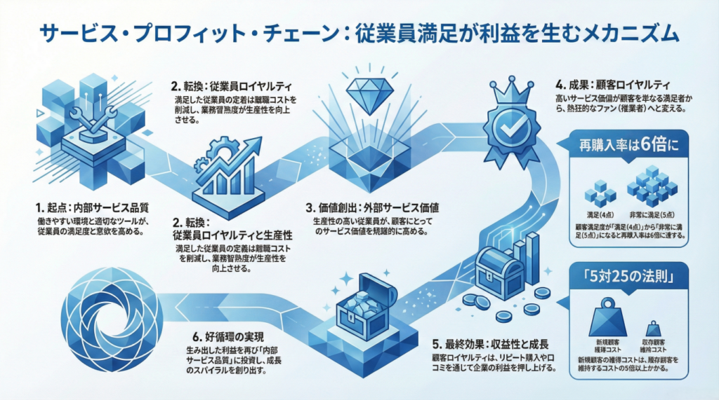 この循環は、以下のプロセスで表現されます。 「従業員への投資 → サービス価値の向上 → 顧客満足とロイヤルティ → 収益増大 → さらなる従業員への投資」