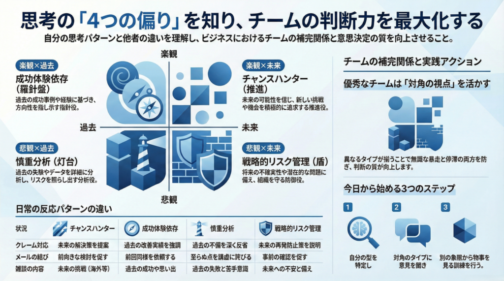 自分のパターンを知り、そして何より「自分と違うパターンを持つ人」を理解できれば、チームの対立は劇的に減り、あなたの判断の質は確実に向上します。